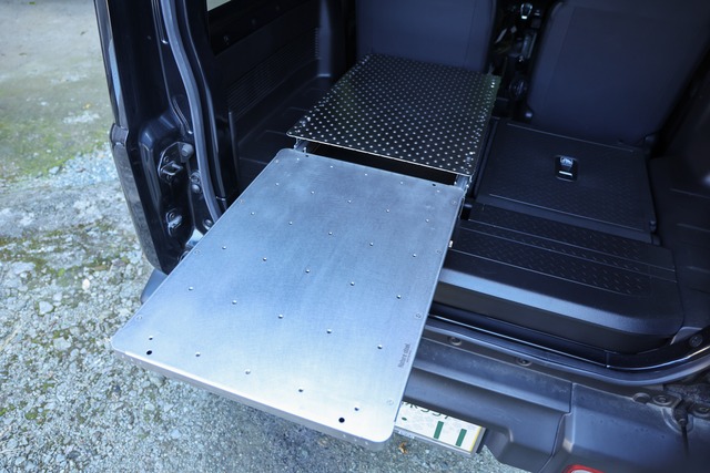 ※積載天板は付属していませんのでご注意ください。 ジムニー専用・DIYベース仕様スライドテーブル あなたの「好き」を無限に拡張する、カスタムベース・テーブル。 <故障しにくい構造> 一般的なベアリング構造ではなく、アルミ製スライドレールを採用 。砂や泥が詰まりにくく、悪路での振動や長期使用でもトラブルが起きにくい設計です 。 付属の専用脚(支点脚)を使用することで、重量ギアにも対応します 。 耐荷重は80kg(メーカー工場内試験にて、スライドを完全に引き出し脚を装着した状態で80kg荷重・24時間保持、変形なし)。 <育てるタフ天板> 天板にはタフなステンレス(SUS430)を採用 。応力腐食割れが発生しにくい特性を持ちます。マグネット対応で、ライトやツールホルダーを自由に配置可能です 。 天板フチには多数のM5ネジ穴を標準装備 。ステーやフックなどを追加し、自由にDIYカスタムが楽しめます 。 錆に強いため、釣りや調理シーンでも気兼ねなく使用できます。 <簡易な取り付け方法> 車体無加工で装着可能 。ジムニー既存のテザーアンカーとヘッドレスト差し込み穴 を利用した専用アタッチメントで強固にダブル固定します(特許出願中)。 オフロード走行中のガタつきやズレを徹底的に排除します。 テーブル本体は工具不要(ストッパーボルトの手回し)で着脱可能。車内での使用、取り外してフィールドテーブルとしての使用など、スタイルに合わせて素早くセットアップ可能です。 <メンテナンス> スライドが引き出しにくい場合は、潤滑油(KURE 5-56等)をレール部分に少量塗布してください。砂や埃が詰まりスライドしない場合でも、ドライバーのみで容易に分解・丸洗いでき、元のスムーズな動作を回復できます。 <スペック> サイズ: 約 縦650mm × 横450mm × 高さ110mm 重量: 約13.5kg 材質: ステンレス(SUS430)、アルミ 特徴: アルミ製スライドレール構造/専用脚付属/マグネット対応/天板M5ネジ穴加工 対応: JB64/74 設計/製造すべて ””MADE IN JAPAN”” <納期について> 受注生産となりますので納期に1ヵ月程要しますのでご了承ください。