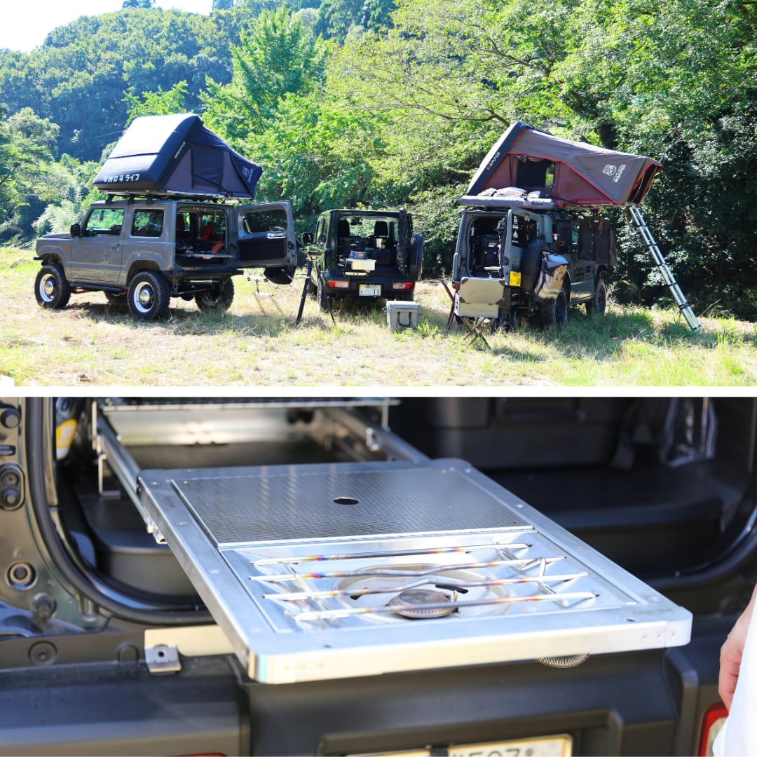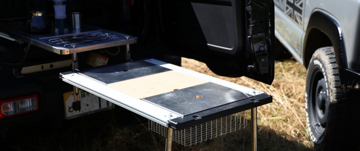※積載天板はついていません。 ジムニー専用・IGTシステム対応スライドテーブル あなたの「好き」を無限に拡張する、最強のアウトドア・キッチンシステム。 <故障しにくい構造> 一般的なベアリング構造ではなく、アルミ製スライドレールを採用 。砂や泥が詰まりにくく、悪路での振動や長期使用でもトラブルが起きにくい設計です 。 付属の専用脚(支点脚)を使用することで、重量ギアにも対応します 。 耐荷重は80kg(メーカー工場内試験にて、スライドを完全に引き出し脚を装着した状態で80kg荷重・24時間保持、変形なし)。 IGT規格 1ユニット×2に対応し、調理台としても、作業台としても活躍します 。 <タフな天板> 天板はIGT規格 1ユニットサイズ×2のフレーム構造を採用 。 標準で「ランナーステンレス」製パネル2枚が付属。特殊エンボス加工によりキズに強く、タフな使用にも耐えます 。 標準パネルを外し、スノーピーク社「フラットバーナー」などの各種IGTユニットを自由にインストール可能です 。 「フラットバーナー」は装着したままスライドテーブル本体を収納可能です 。 <簡易な取り付け方法> 車体無加工で装着可能 。ジムニー既存のテザーアンカー とヘッドレスト差し込み穴 を利用した専用アタッチメントで強固にダブル固定します(特許出願中) 。 オフロード走行中のガタつきやズレを徹底的に排除します。 テーブル本体は工具不要(ストッパーボルトの手回し)で着脱可能 。車内での使用、取り外してフィールドテーブルとしての使用など、スタイルに合わせて素早くセットアップ可能です。 <メンテナンス> スライドが引き出しにくい場合は、潤滑油(KURE 5-56等)をレール部分に少量塗布してください 。砂や埃が詰まりスライドしない場合でも、ドライバーのみで容易に分解・丸洗いでき、元のスムーズな動作を回復できます 。 <スペック> サイズ: 約 縦650mm × 横450mm × 高さ110mm 重量: 約13kg 材質: ステンレス(SUS304、ランナーステンレス)、アルミ 特徴: アルミ製スライドレール構造/専用脚付属/IGT規格(1ユニット×2)対応/バーナー収納可能 対応: JB64/74 【設計/製造すべて ””MADE IN JAPAN””】 <納期について> 受注生産となりますので納期に1ヵ月程要しますのでご了承ください。