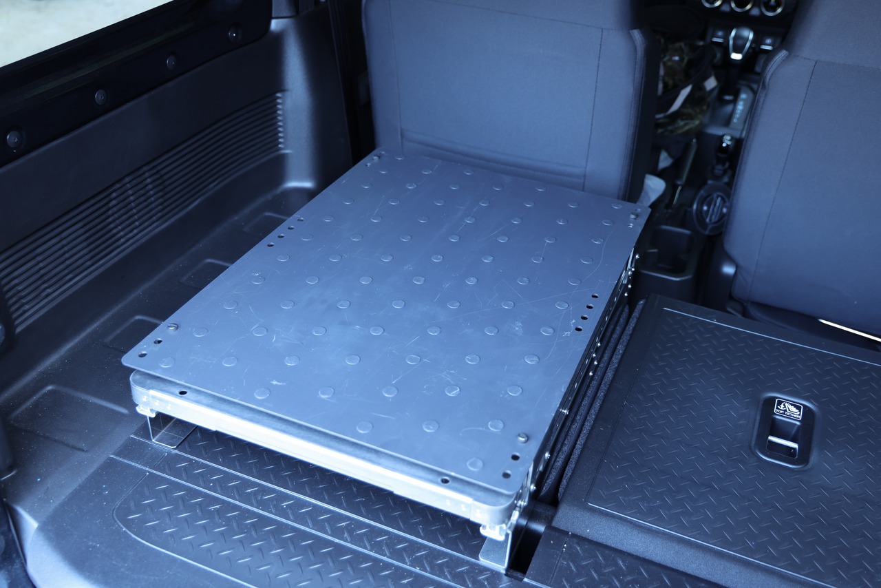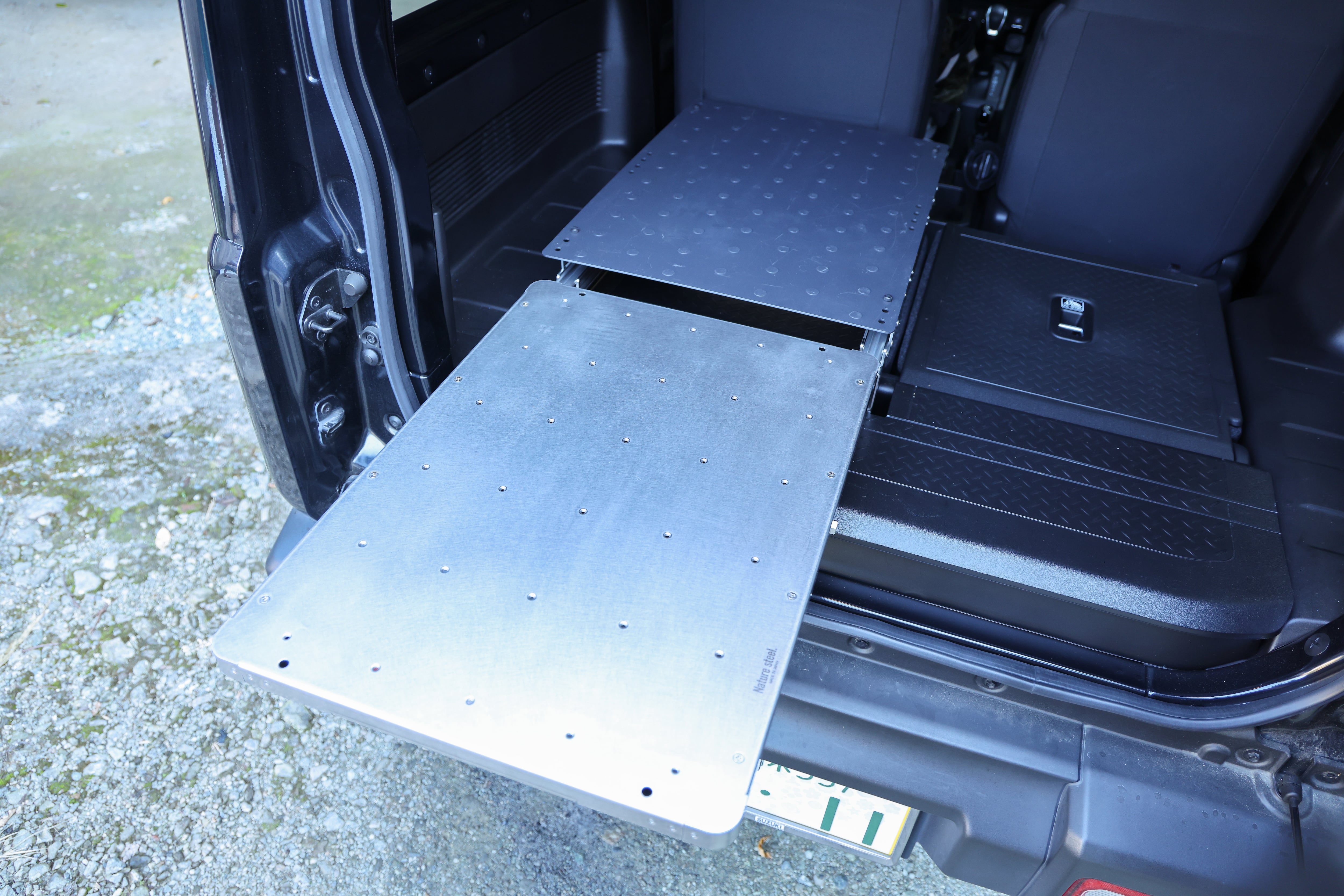 ジムニーの積載効率を劇的に向上させる、マグネット対応のスチール製天板。