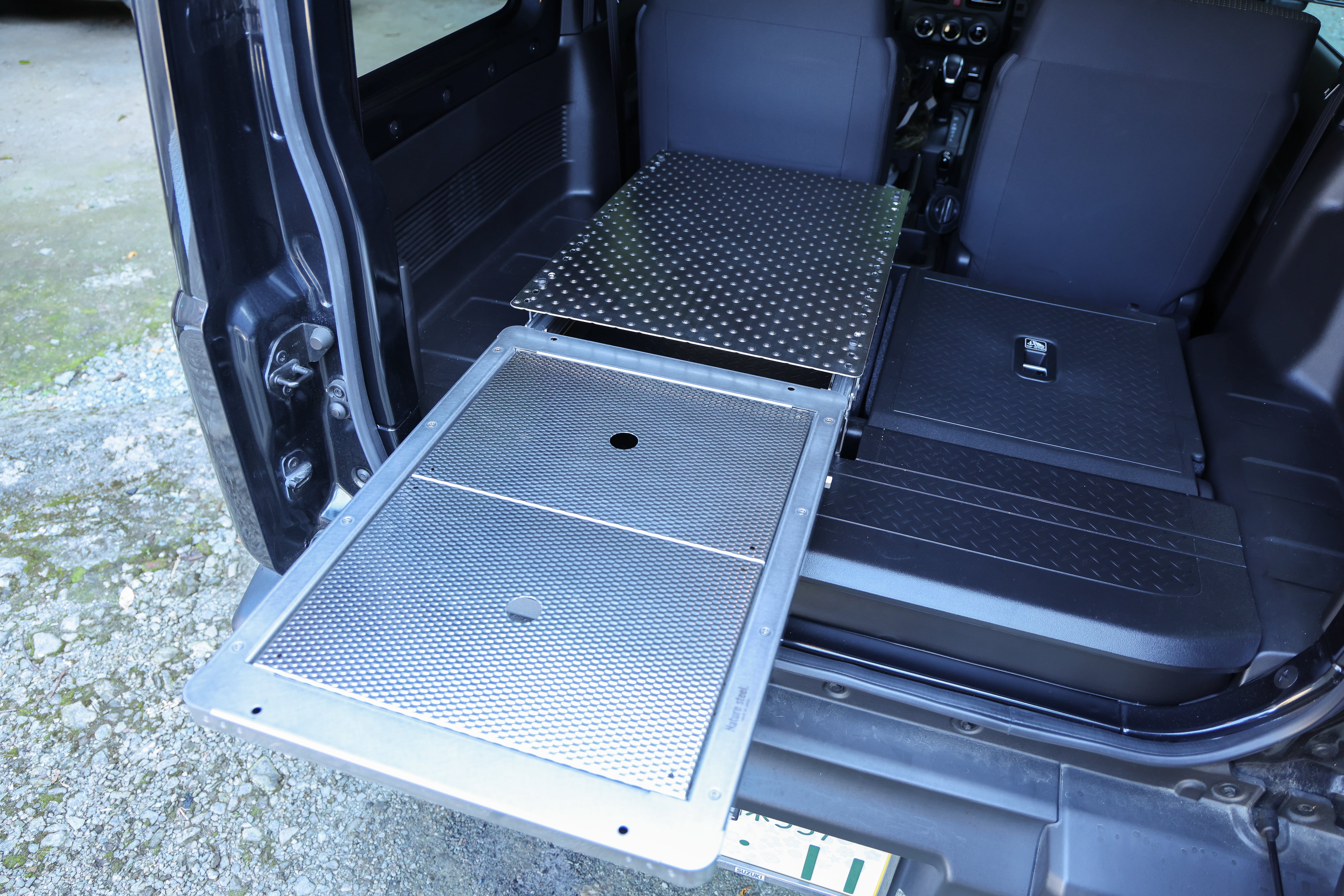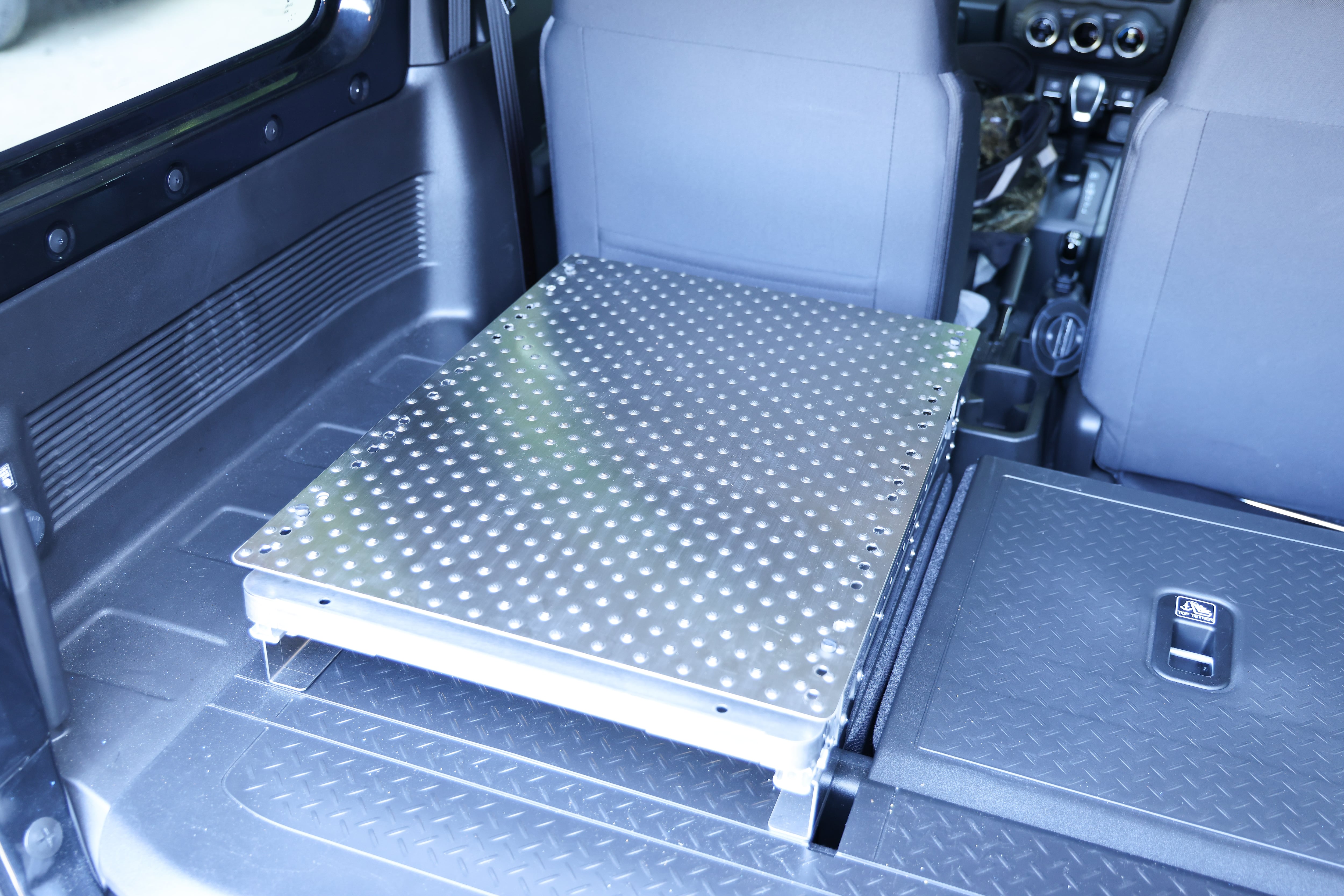 ジムニーの限られた荷室空間を上下に分割し、効率的な積載を実現します。